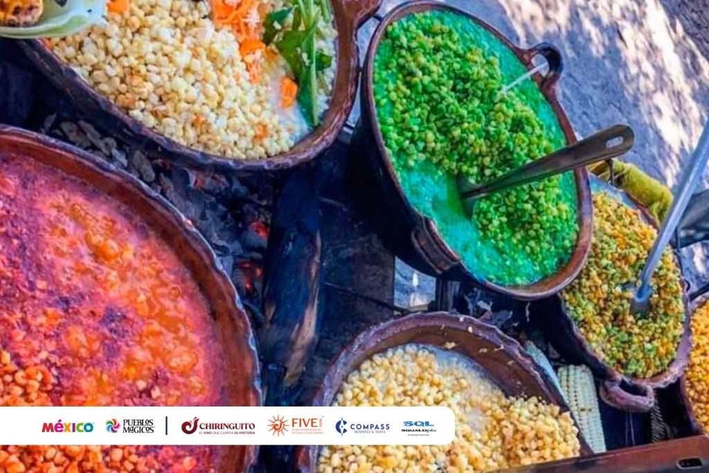 En la plaza principal encontrarás esquites hechos con granos de diferentes tipos de maíz (azul, rojo, amarillo), hervidos con epazote y servidos con mayonesa, queso y chile.