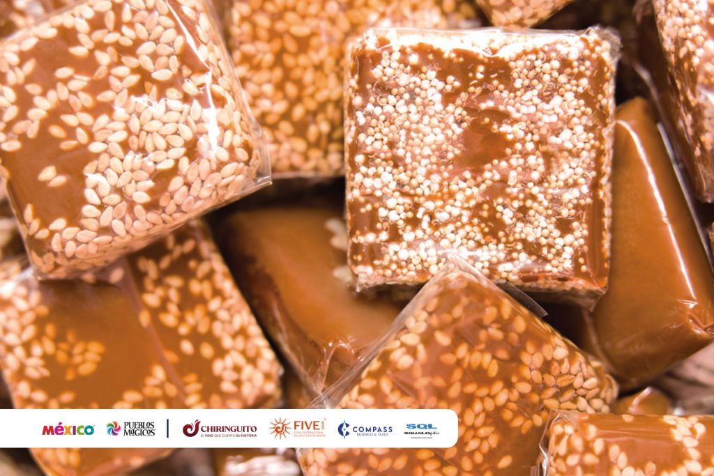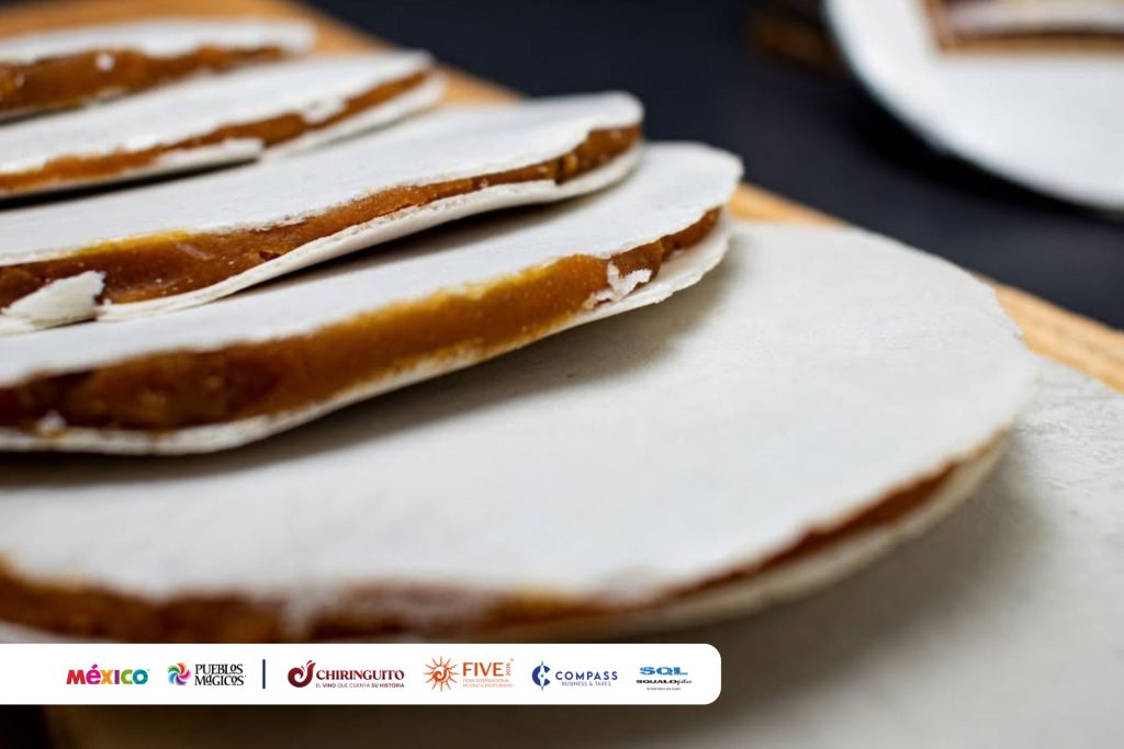 Wafers finos rellenos de dulce de leche de cabra (cajeta) y rodeados de semillas de pepita o amaranto.
