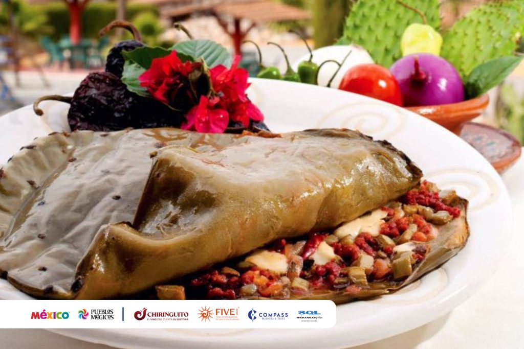 Un platillo único y de nombre curioso. Consiste en una penca de nopal grande rellena de nopales picados, cebolla, jitomate, chiles y a veces carne o camarón, todo cocinado dentro de la misma penca asada a las brasas o en comal.